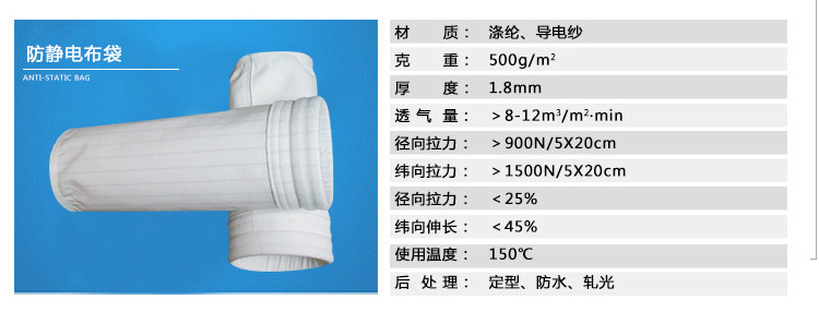 滌綸防靜電針刺氈濾袋:可分為兩種,一種是在滌綸針刺氈的基布中加入導(dǎo)電紗制成條紋防靜電除塵布袋;另一種是在濾布纖維面層中加入一定配比導(dǎo)電纖維(碳纖維)制成滌綸混導(dǎo)電針刺氈除塵布袋。兩者都具有良好的抗靜電能力,技術(shù)參數(shù)均可達(dá)到下列標(biāo)準(zhǔn):